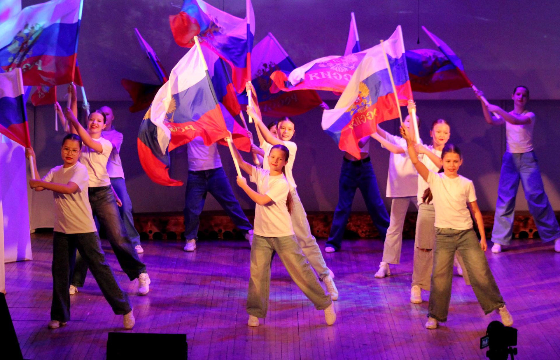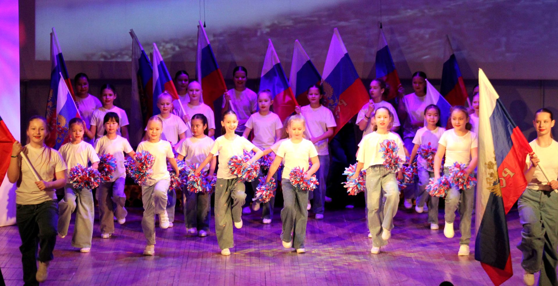 Праздничную программу открыла студия чирлидинга «Черри» (руководитель Е.Заец) с флаговой композицией «Россия, Россия!», задав патриотический тон всему концерту. Далее с двумя песнями выступил народный коллектив РС(Я) «Народный хор ветеранов» (руководитель Н.Иваниченко).Продолжил праздничную программу ярким, динамичным танцем ансамбль народного танца «Вдохновение» (руководители А.Микрюков и К.Тагирова).