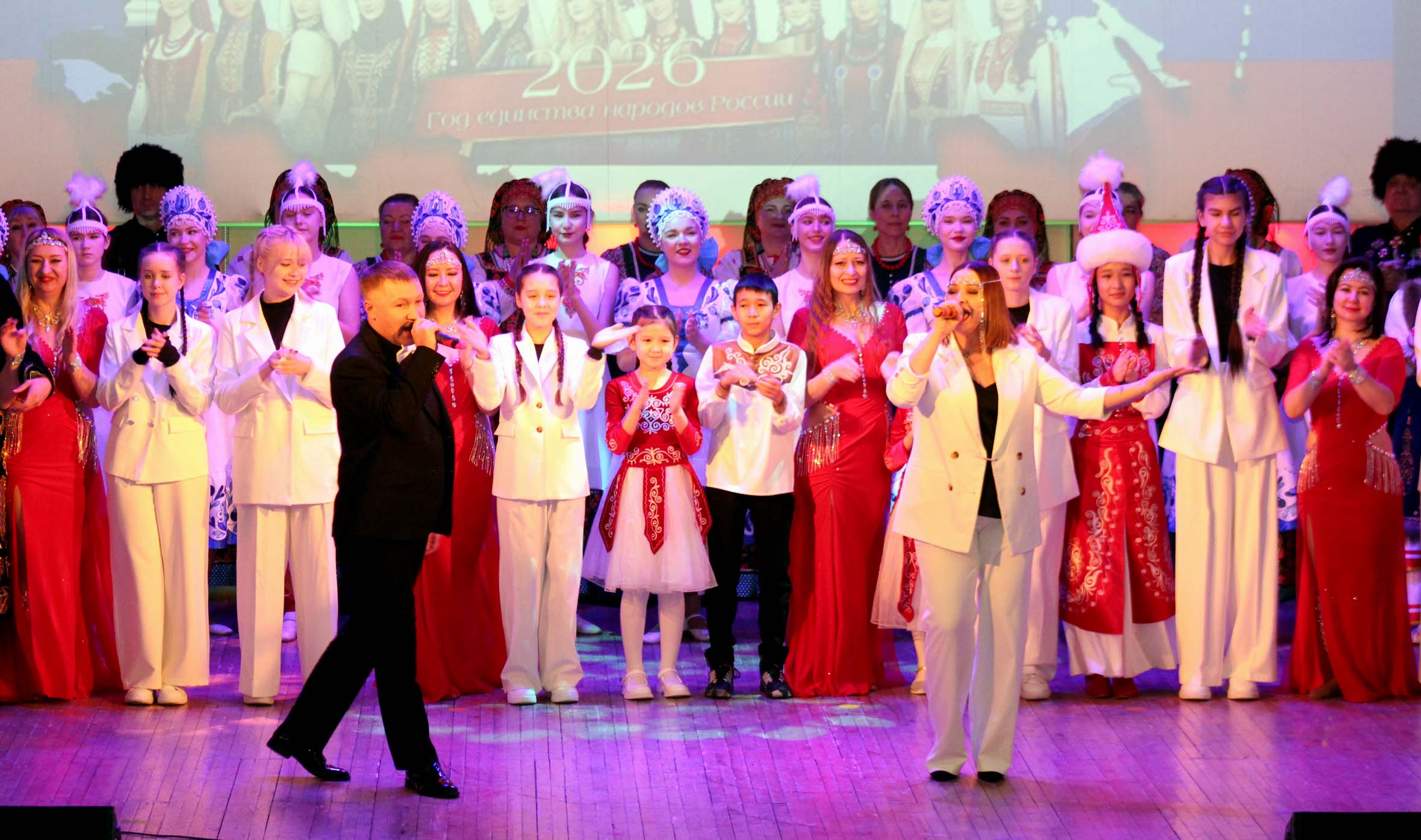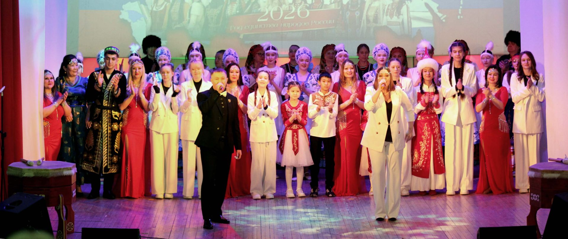 Мероприятие началось с видеопролога, в котором были продемонстрированы официальные обращения Владимира Путина и Айсена Николаева об объявлении 2026 года соответствующими статусами, после чего прозвучали гимны России и Якутии. Далее, под барабанный аккомпанемент участниц театра огня и света «Удаган» (руководитель А.Давлятшин) и оригинальное световое решение были представлены различные национальные культуры России – русская, якутская, бурятская, башкирская, киргизская, таджикская и казачья. Открылся концерт песней «Мы народы России» в исполнении Яны Забелиной в сопровождении вокального ансамбля «Эдельвейс».