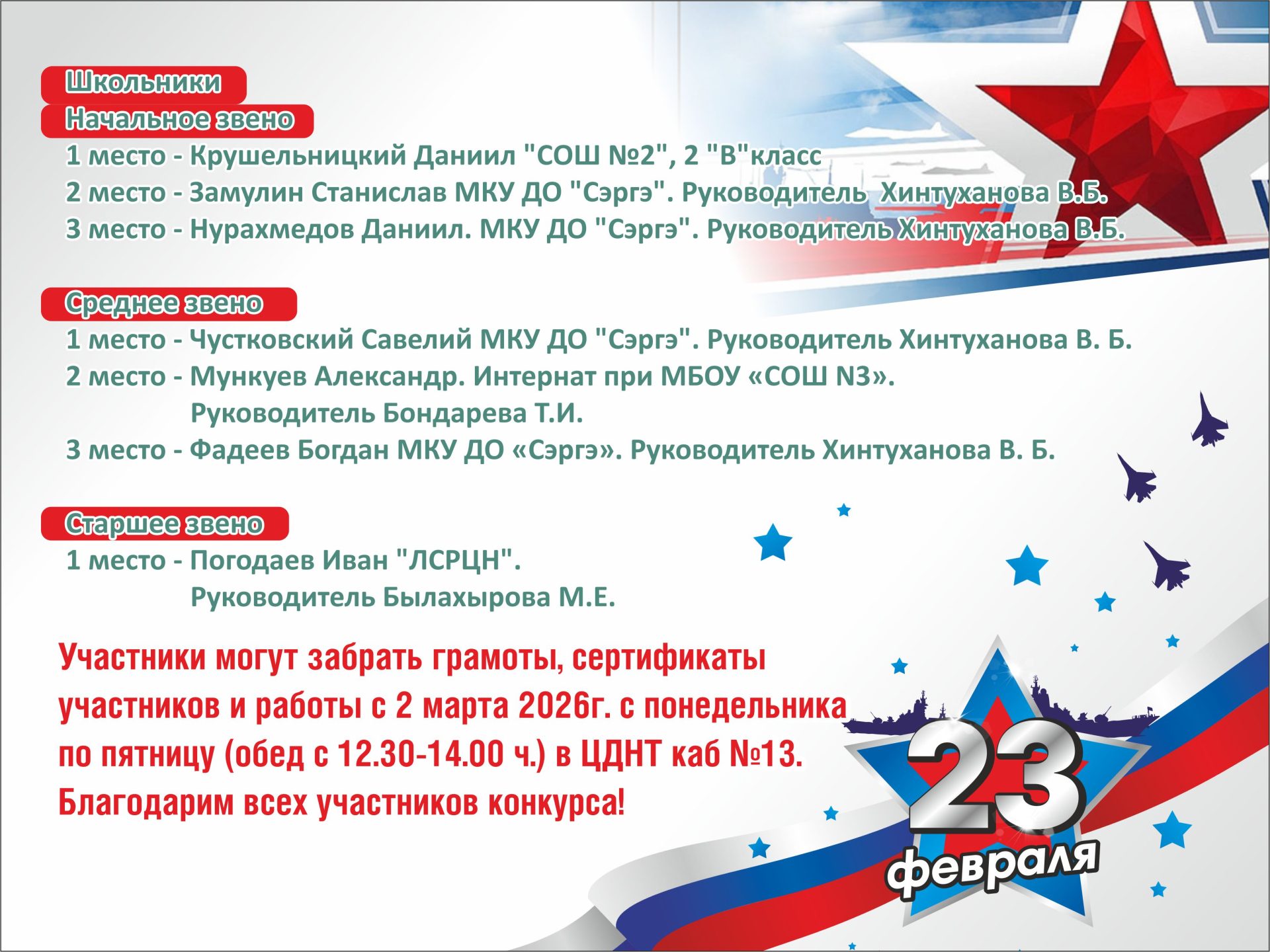 1 место — Чустковский Савелий МКУ ДО «Сэргэ». Руководитель Хинтуханова В. Б.